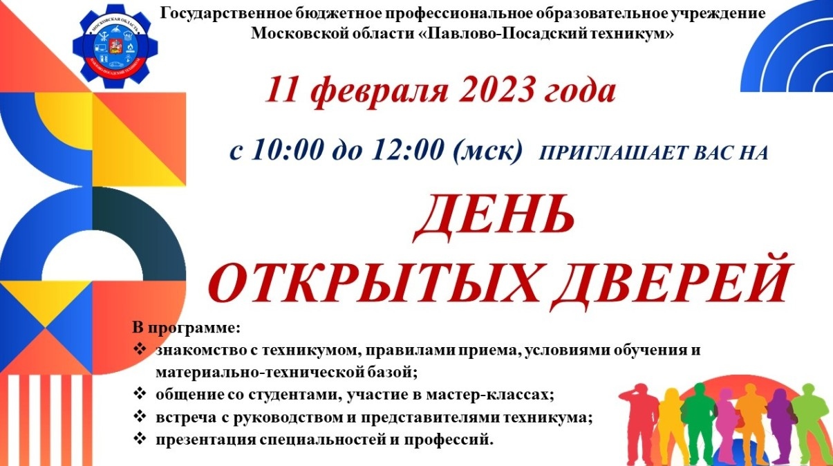 11 февраля состоится день открытых дверей в Павлово-Посадском техникуме. Всех, кто хочет познакомиться с техникумом, правилами приема, условиями обучения и материально-технической базой,