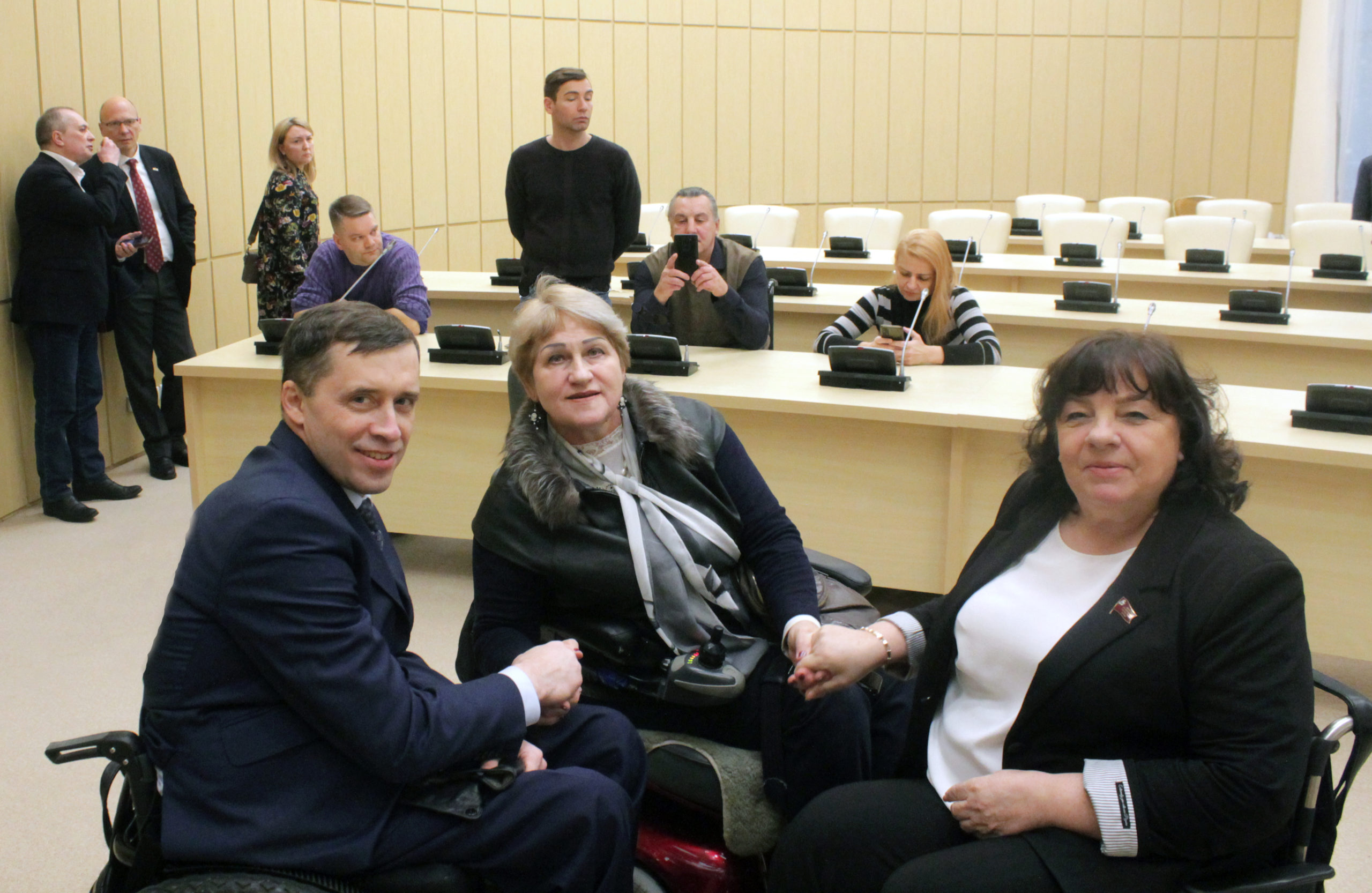На фото: Заместитель председателя Комитета Госдумы по труду социальной политике и делам ветеранов Михаил Борисович Терентьев, руководитель некоммерческого фонда «Социальная адаптация инвалидов» Татьяна Михайловна Набиева, депутат Московской областной Думы Татьяна Владимировна Карзубова.