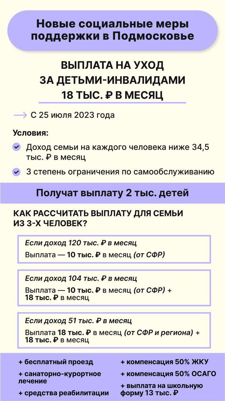 В своем обращении к жителям Подмосковья губернатор Андрей Воробьев озвучил ряд новых мер поддержи, которые вводятся в этом году. Всё касается заботы о детях, старшем поколении, людях с особенностями здоровья. Так, повысили ежемесячные доплаты до 18 тыс. рублей неработающим пенсионерам, одиноко проживающим и проживающим в семье, состоящей из неработающих пенсионеров. Мера касается тех, кто старше 65 лет и проживает в Подмосковье более 10 лет. Сделали перерасчет с начала года, поэтому люди получат доплату сразу за предыдущие месяцы, одним зачислением. Услуга проактивная, никаких заявлений подавать не надо. Выплата придет после 20 августа. Увеличили выплаты на школьную форму для многодетных семей с низкими доходами с 3 до 10 тыс. рублей. Деньги поступят на счет родителей 3 августа автоматически. Вводится новая выплата для семей с детьми-инвалидами, у которых III степень ограничения по самообслуживанию — 18 тыс. рублей. Родителям необходимо подать заявление на региональном портале «Госуслуги». Заявления принимаются с 25 июля. Еще одно нововведение — электронный паспорт льготника. Теперь все документы в одном месте, в кармане. 2,6 млн жителей получают льготы — 820 тыс. пенсионеров, 568 тыс. ветеранов труда, 398 тыс. инвалидов и другие. Получить паспорт просто: надо зайти на региональный портал госуслуг, он будет доступен в уведомлениях, потом просто скачать его. Паспорт достаточно предъявить на экране телефона в магазинах, аптеках, музеях или кинотеатрах. Источник и фото: телеграм-канал Воробьёв LIVE