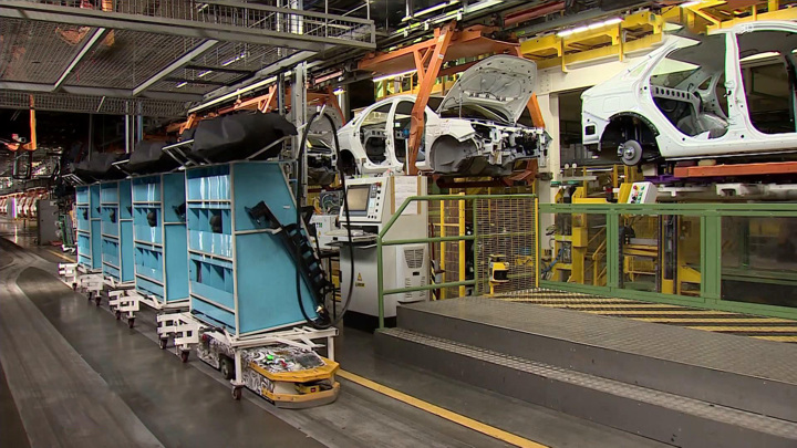 Каждые 90 секунд с этого конвейера сходит новенькая "Лада Веста" (Lada Vesta). Двигатель, коробка передач, кузов, детали шасси, кресла – все сделано в России. Промышленное производство модели на заводе в Тольятти стартовало в марте 2023 года. И она уже стала одной из самых продаваемых моделей в стране.