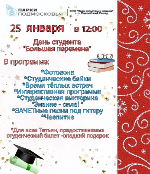 25 января в Павловском Посаде состоится праздничная программа «Большая перемена», посвященная Дню студента. Жителей и гостей городского округа ждет подготовленная фотозона, студенческие байки, интерактивная программа, студенческая викторина, ЗАЧЕТные песни под гитару, чаепитие и многое другое. Время теплых встреч подготовлено для всех гостей городского парка культуры и отдыха. «Знание – сила!» — именно с этим девизом встретят участников праздника его организаторы. Для всех Татьян, предоставивших студенческий билет, будет подготовлен сладкий подарок.