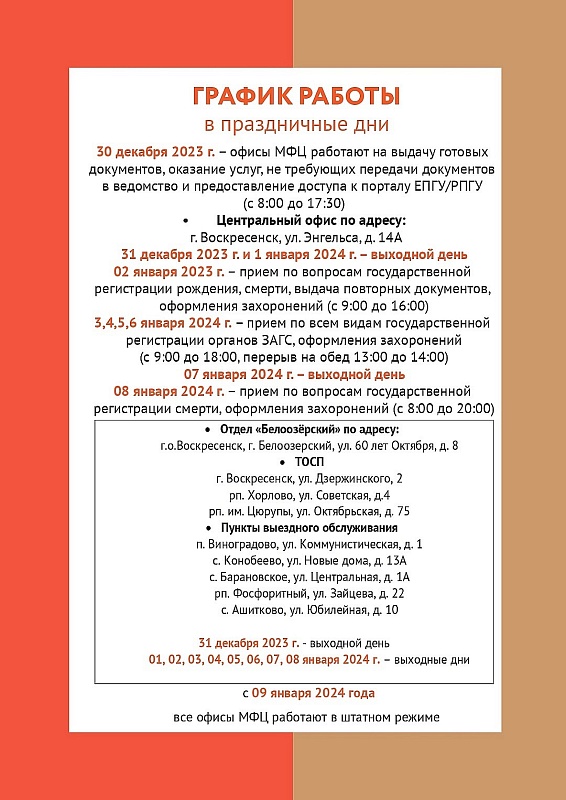 30 декабря 2023 года офисы МФЦ работают на выдачу готовых документов. Оказание услуг, не требующих передачи документов в ведомство, и предоставление доступа к порталу ЕПГУ/РПГУ - с 8.00 до 17.30.