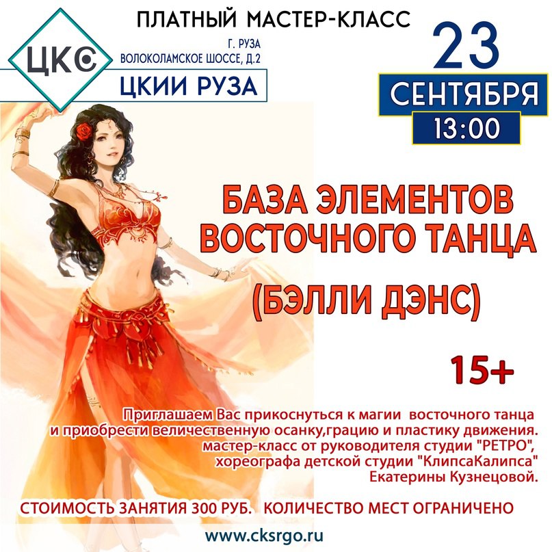 23 сентября в Рузском центре культуры и искусств состоится мастер-класс «База элементов восточного танца (бэлли дэнс)».