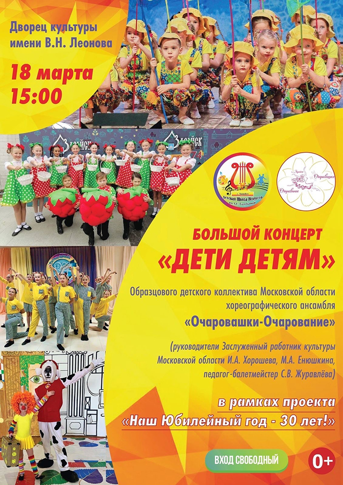 Приглашаем вас 18 марта в 15:00 во Дворец культуры имени В.Н. Леонова на большой концерт «Дети детям» Образцового детского коллектива Московской области «Хореографический ансамбль «Очаровашки-Очарование»Последние новости