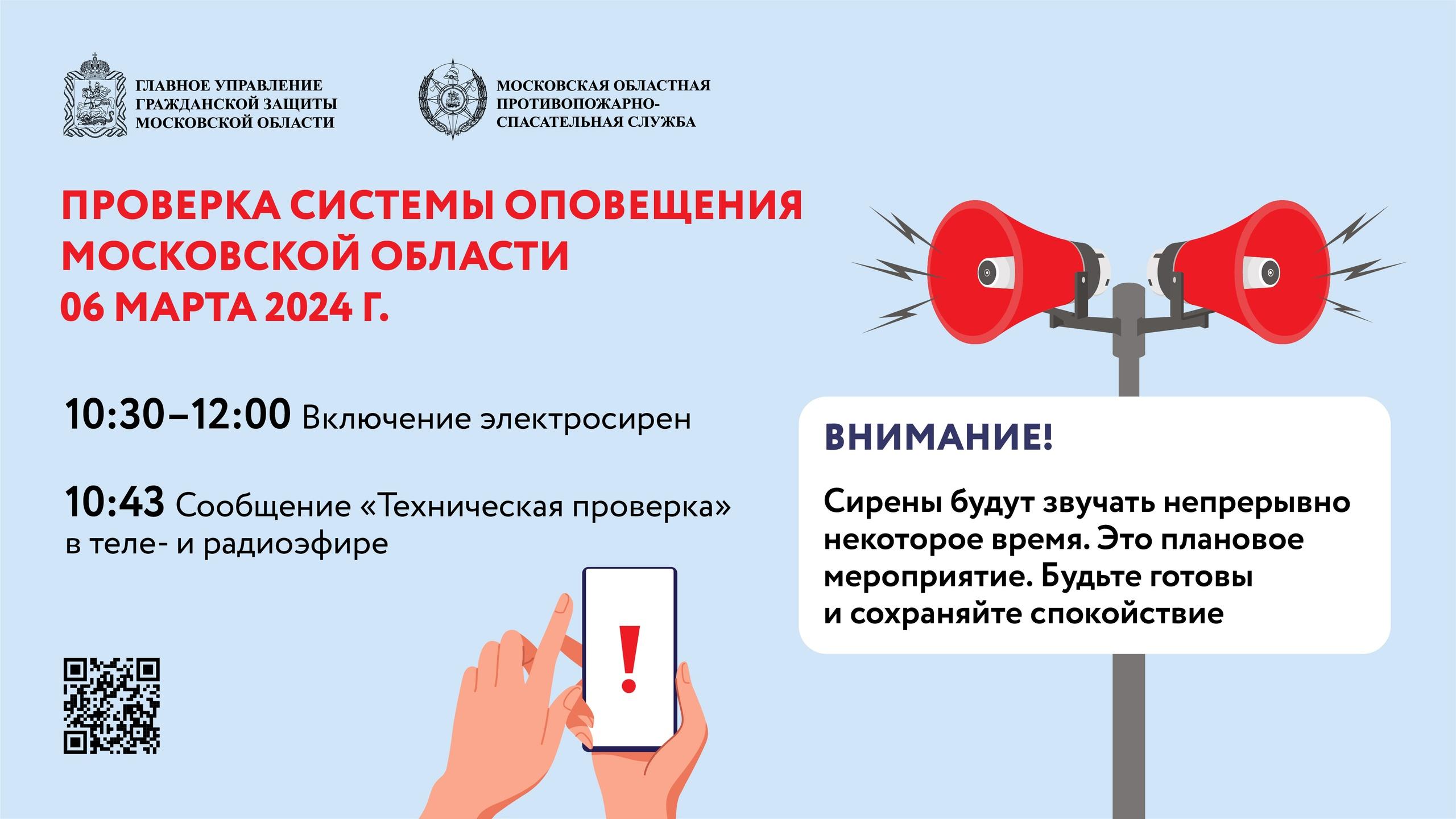 Проверка запланирована на 6 марта, с 10:30 до 12:00. В 10:43 по телевидению и радио передадут речевое сообщение о технической проверке.