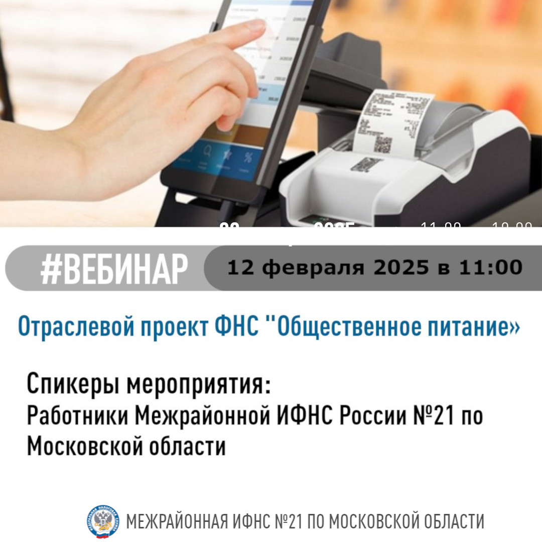 12 февраля в 11.00 налоговая инспекция проведет бесплатный вебинар на тему: «Отраслевой проект ФНС «Общественное питание»». В качестве лекторов выступят работники Межрайонной ИФНС России №21 по Московской области.
