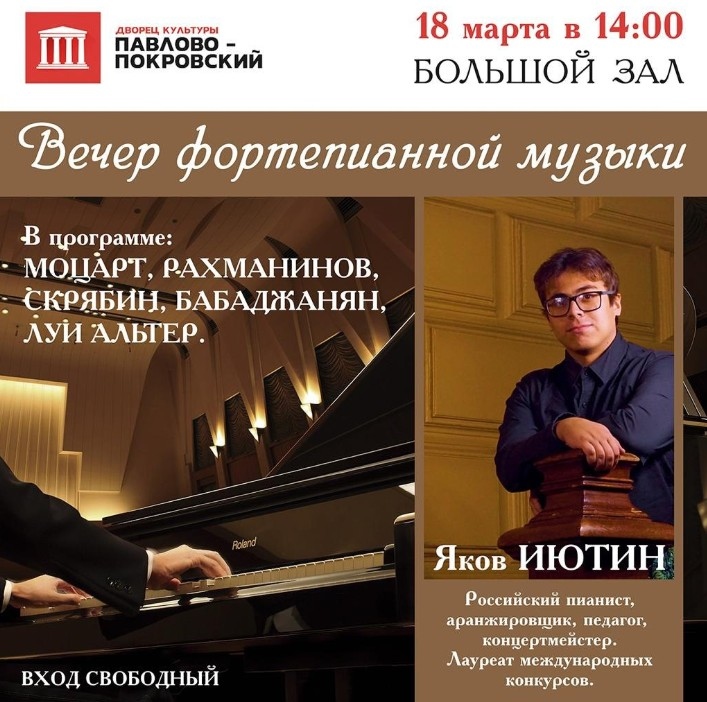 18 марта в 14:00 в Большом зале Дворца культуры «Павлово-Покровский» состоится Вечер фортепианной музыки. Свое выступление подарит всем присутствующим Российский пианист, аранжировщик, педагог, концертмейстер, Лауреат международных конкурсов Яков Иютин. Он исполнит произведения таких композиторов, как Моцарт, Рахманинов, Скрябин, Бабаджанян, Луи Альтер. Вход на концерт свободный.
