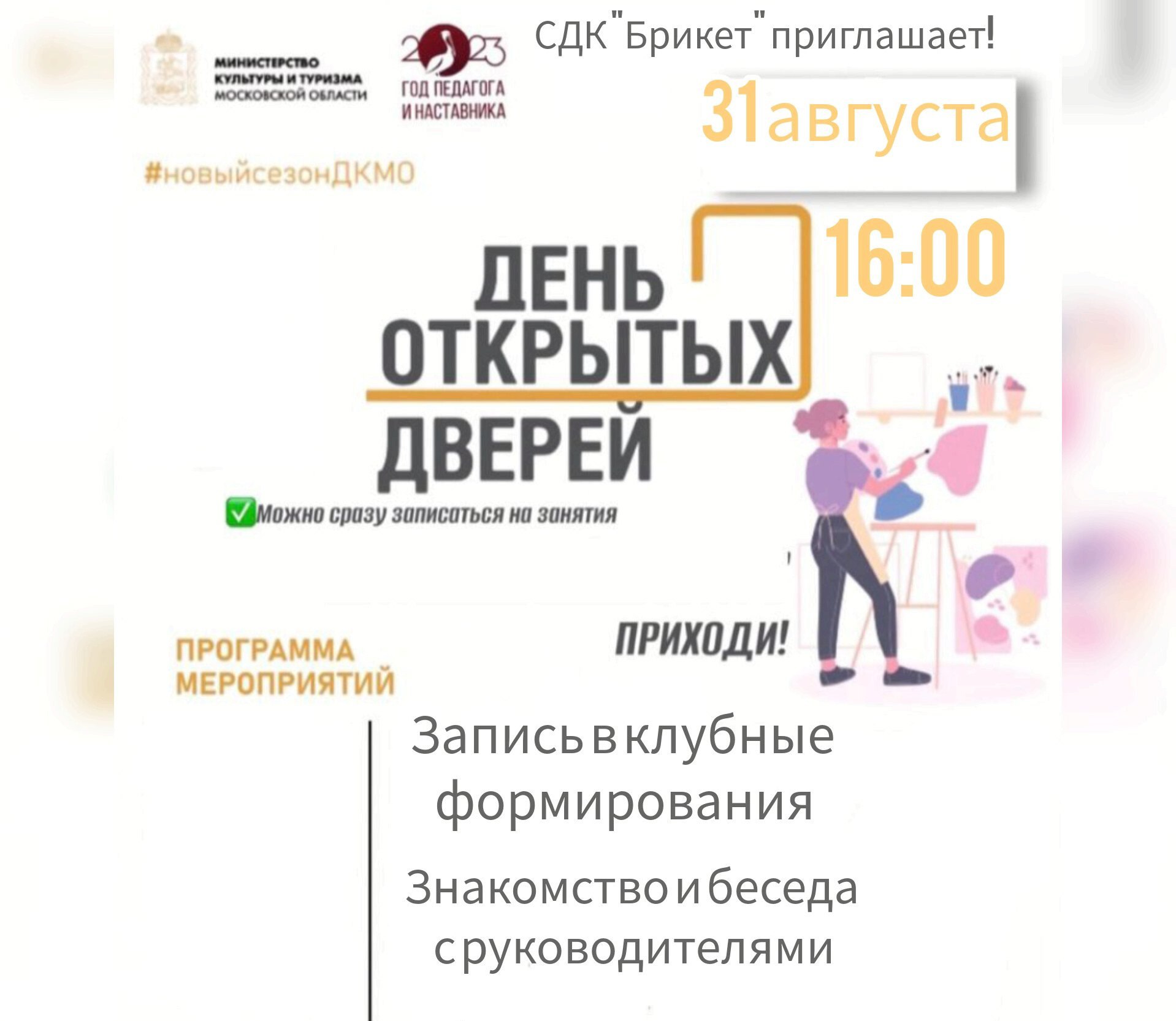 31 августа в Доме культуры поселка Брикет Рузского городского округа пройдет День открытых дверей.